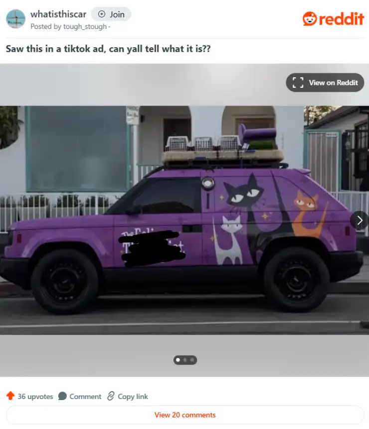 Второй двухдверный прототип, весьма напоминающий Rivian R3, был также замечен в этом районе. Эта версия выделялась фиолетовой пленкой с логотипами, рассказывающими о кошачьей терапии.