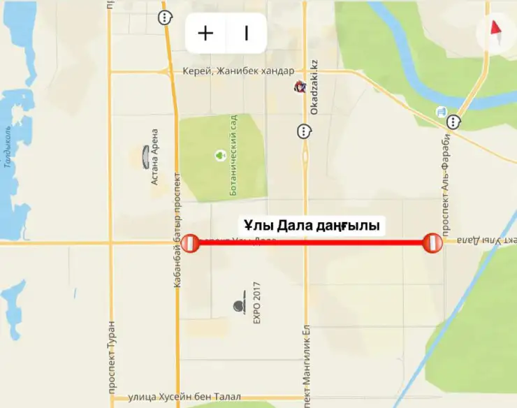 - улица Каныша Кайсенова - от улицы Бухар жырау до проспекта Улы Дала;