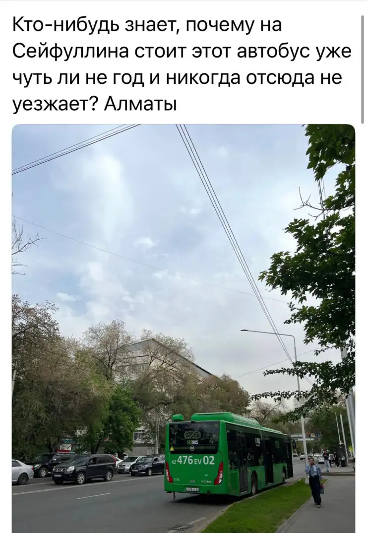 "Кто-нибудь знает, почему на Сейфуллина стоит этот автобус уже чуть ли не год и никогда отсюда не уезжает? Алматы", - отметил мужчина в своем посте.