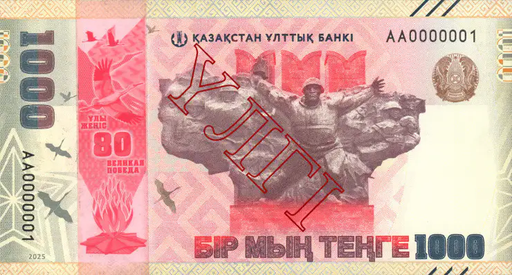 Национальный банк Казахстана с 9 мая 2025 года выпускает в обращение юбилейную банкноту номиналом 1000 тенге, посвященную 80-летию Великой Победы. Тираж банкноты ограничен и составит пять миллионов экземпляров.