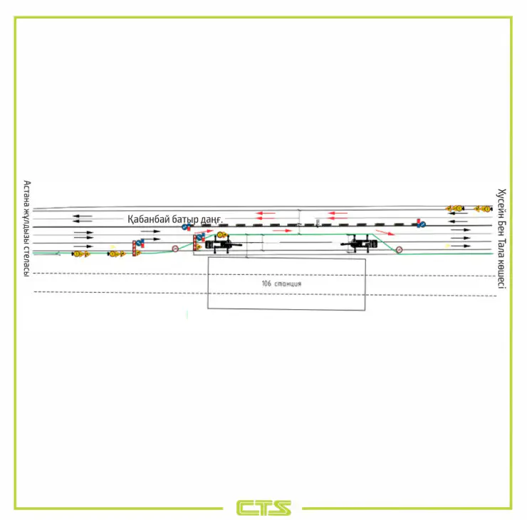 "С 22:00 22 апреля по 20 сентября, в связи с проведением работ по возведению фасада здания станции 106, на участке проспекта Кабанбай батыра от стелы "Астана Жұлдызы", не доезжая улицы Хусейн бен Талала, будет ограничено движение транспорта путем сужения проезжей части дороги с трех полос в одну полосу", - поясняется в пресс-релизе.