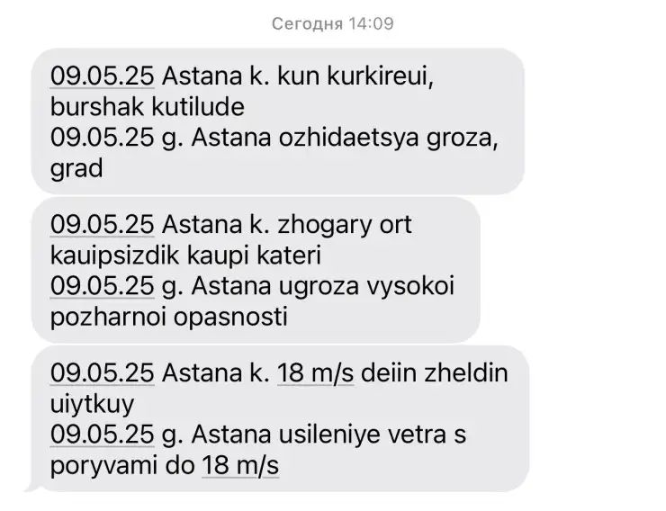Астанчан снова "засыпало" SMS с предупреждениями о непогоде на День Победы.