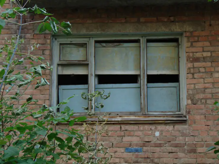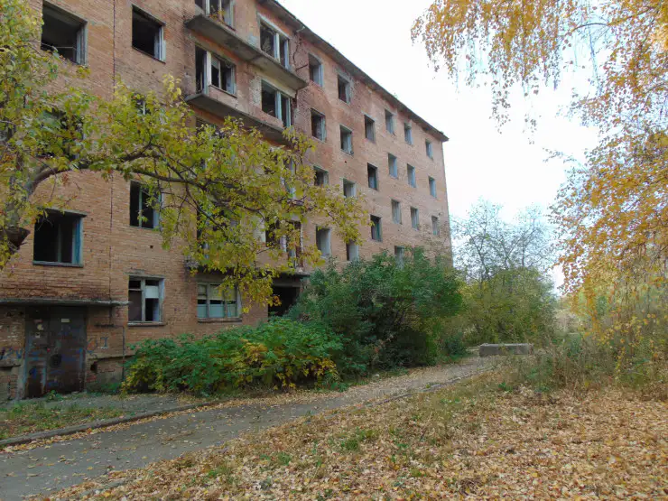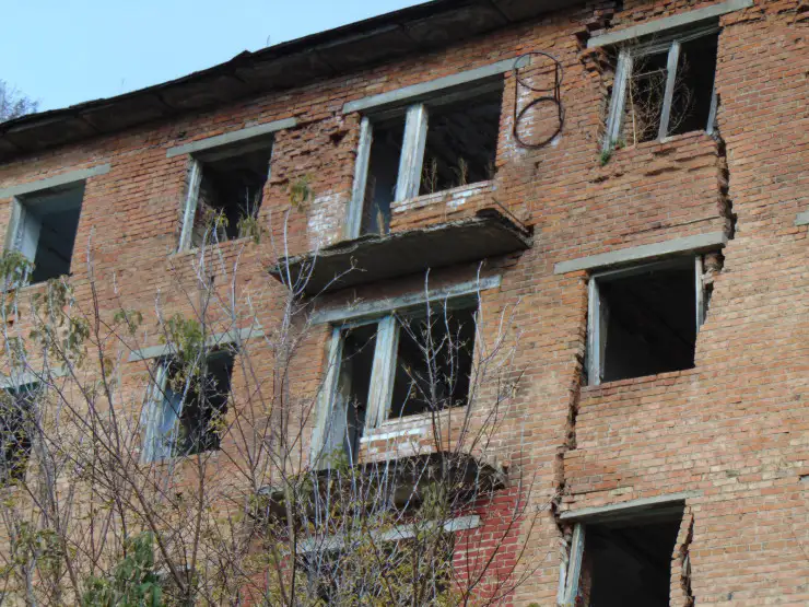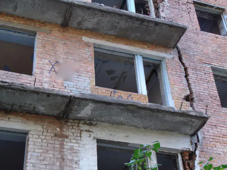 Дом №7 по улице Юбилейной выглядит как иллюстрация к фильму ужасов: огромная трещина, пересекающая здание от крыши до фундамента, разрушенные балконы, выбитые окна, заросшие бурьяном подъезды. Местные жители называют его "домом-призраком".