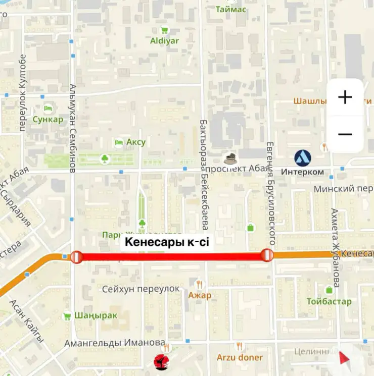- улица Кенесары - от улицы Сембинова до улицы Брусиловского. Ограничение с 5 по 15 мая;