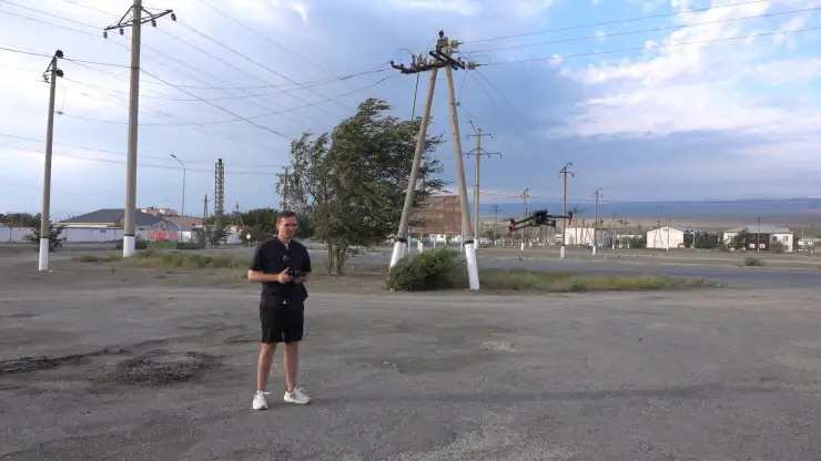 Попытка запустить дрон для съемки с воздуха не удалась из-за сильного ветра, который сносил квадрокоптер.