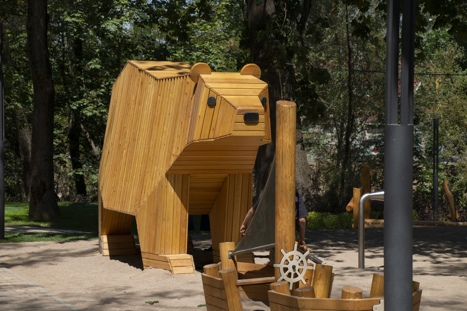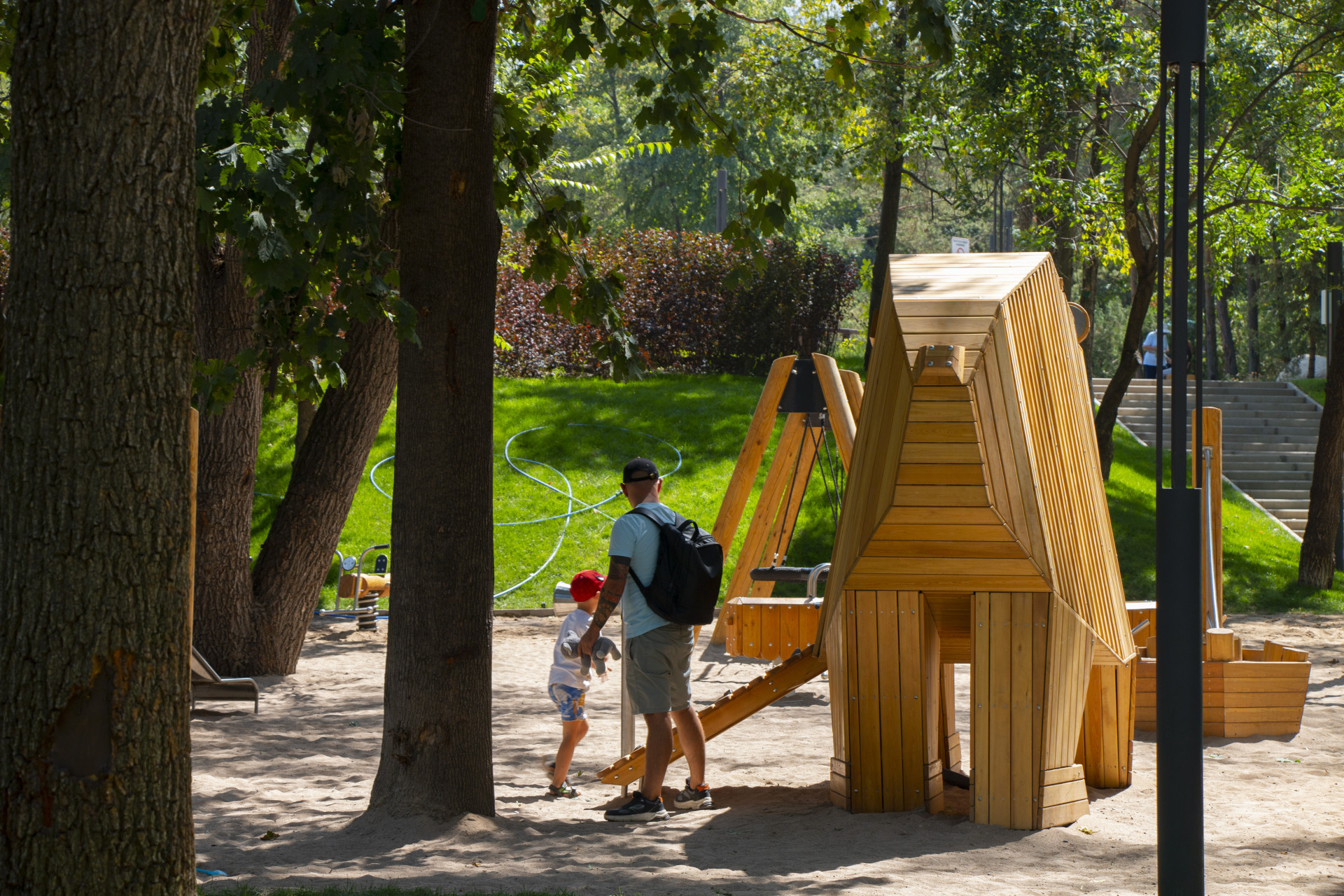 Воркаут-зона привлекает как молодежь, так и людей старшего возраста, а детская площадка выполнена из натурального дерева, что делает её более экологичной.