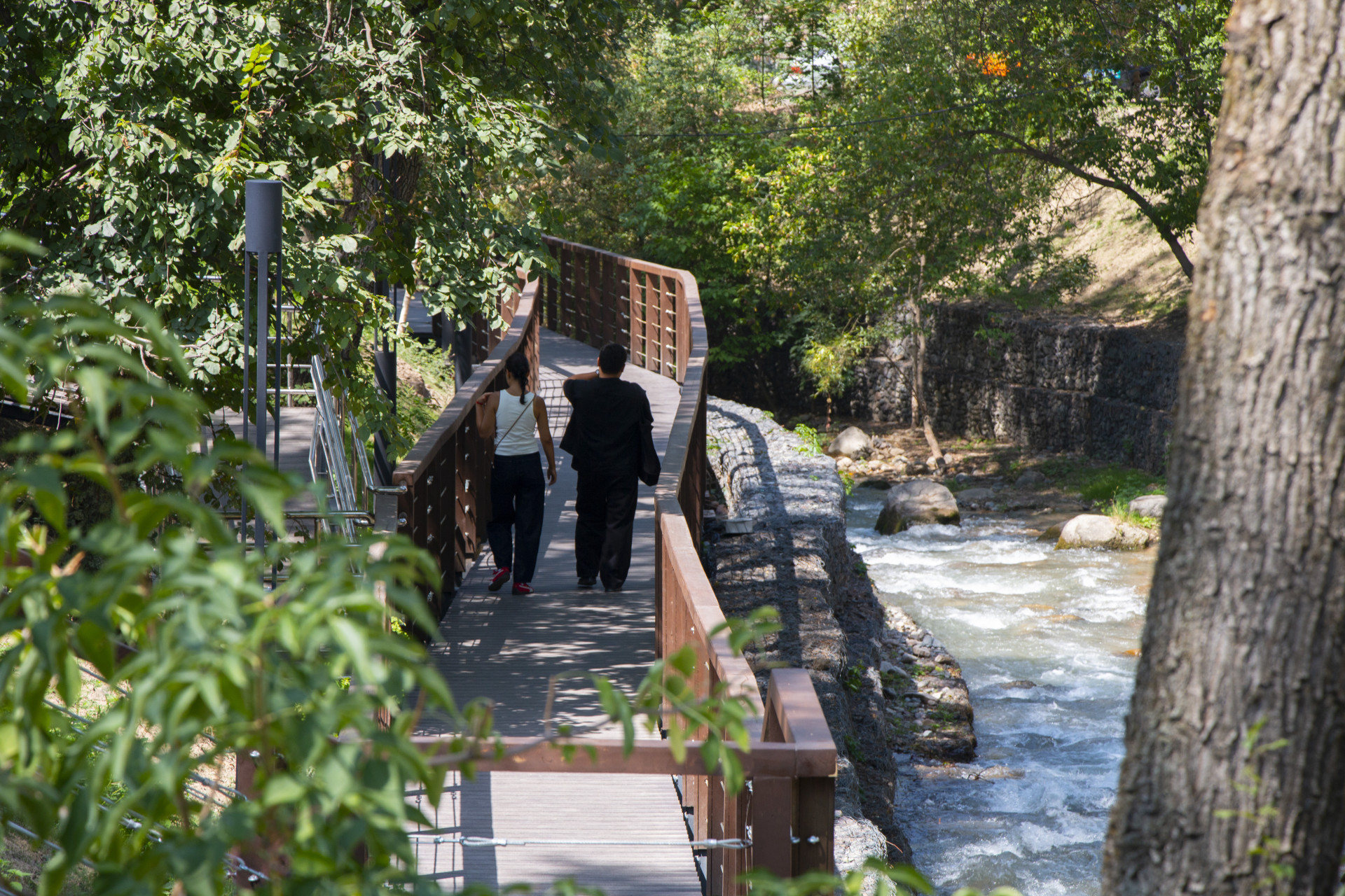 Новая пешеходная тропа вдоль реки выполнена из дерева и оборудована стильными ограждениями и перилами, что позволяет маломобильным гражданам свободно передвигаться.
