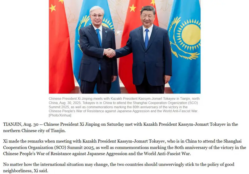 Публикация агентства Xinhua связывает переговоры в Тяньцзине с повесткой саммита ШОС, отметив активное участие Казахстана в организации. Издание приводит слова Токаева о готовности работать вместе с Китаем в области инфраструктуры, технологий и безопасности.