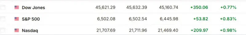 Индекс Dow Jones вырос на 0,77%, S&P 500 - на 0,83%, NASDAQ - на 0,98%.