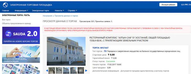 На электронной торговой площадке было выставлено на продажу конфискованное имущество осужденного: ресторанный комплекс 'Алтын-Саф', торговый дом 'Монолит' и автомобиль марки Volkswagen Multivan.