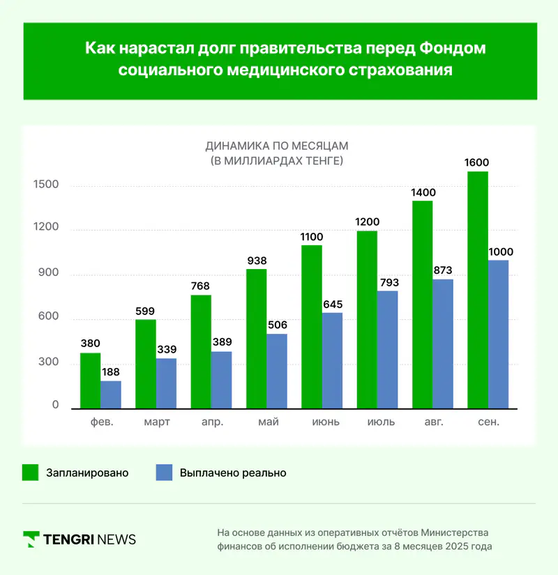 Фонд социального медицинского страхования финансируется двумя основными источниками: обязательными взносами граждан и целевыми взносами от государства. В 2025 году правительство должно было перечислить 2,3 триллиона тенге, однако к 12 сентября было выплачено только 1 триллион, что привело к образованию долга в 739,3 миллиарда тенге. Из этой суммы 365,5 миллиарда тенге составляют задолженности по гарантированному пакету медицинской помощи (ГОБМП), а 373,7 миллиарда — по ОСМС.