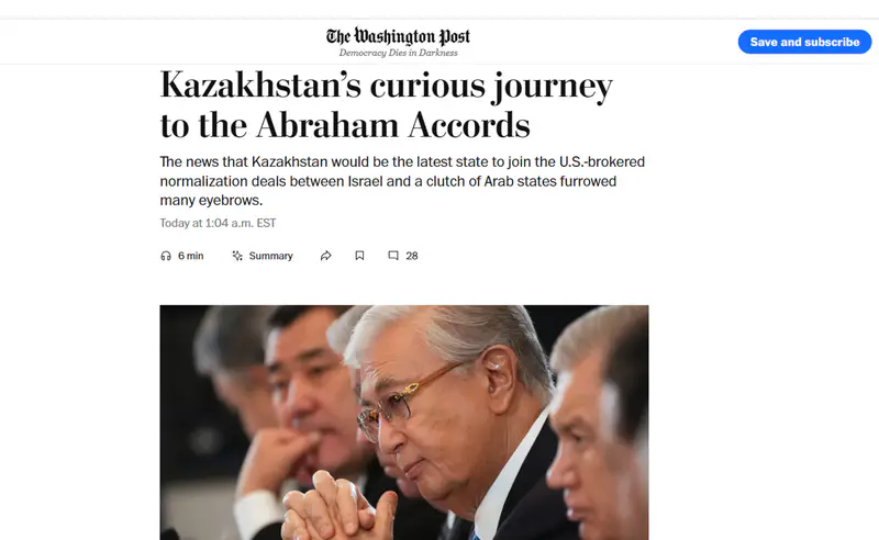 Американское издание The Washington Post опубликовало колонку журналиста Ишана Тарура, посвящённую решению Казахстана присоединиться к "Соглашениям Авраама". Этот шаг вызвал удивление у западных наблюдателей, так как Казахстан не имеет истории вражды с Израилем и установил с ним официальные отношения ещё в 1992 году.