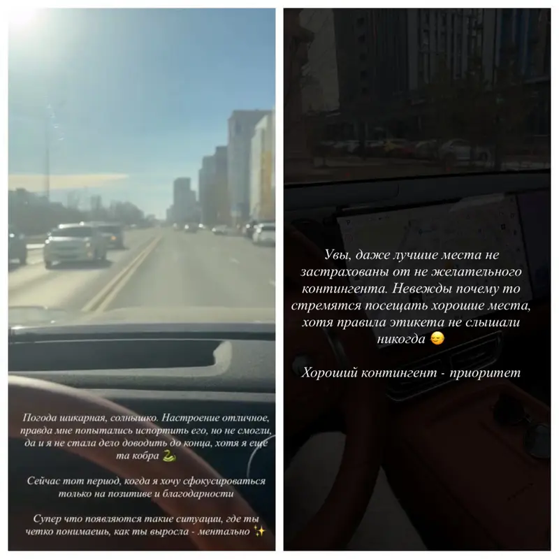 "Погода шикарная, солнышко. Настроение отличное, правда, мне попытались испортить его, но не смогли, да и я не стала дело доводить до конца, хотя я еще та кобра. Сейчас тот период, когда я хочу сфокусироваться только на позитиве и благодарности. Супер, что появляются такие ситуации, где ты четко понимаешь, как ты выросла – ментально", – написала Алтынбекова.