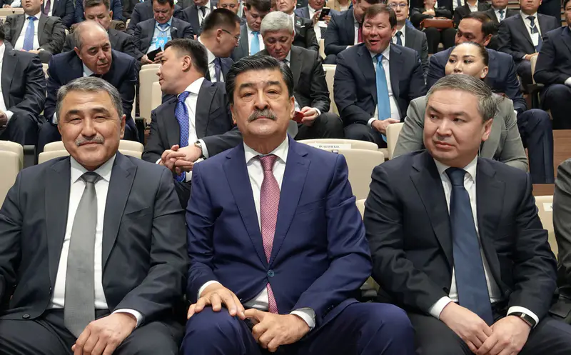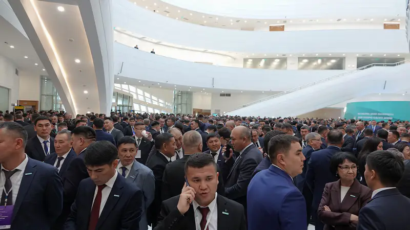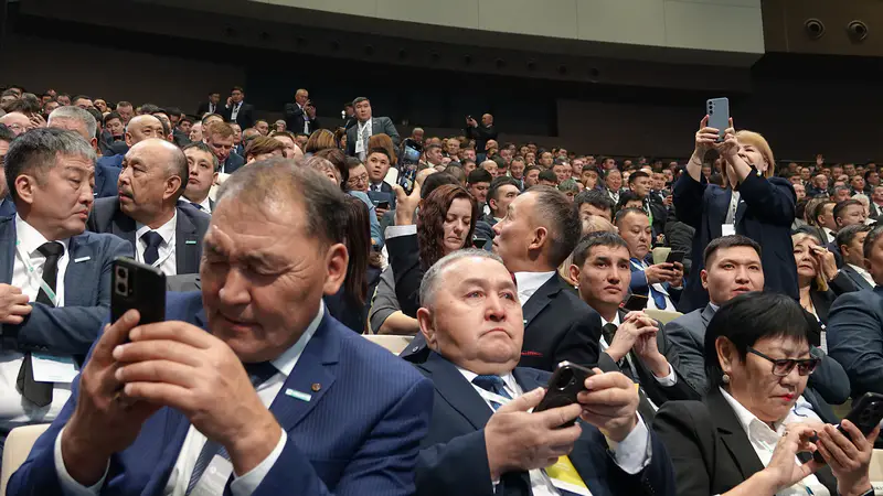 На мгновение кажется, что это не форум сельских акимов, а парад костюмов-двоек, где участники соревнуются в оттенках синего и серого.