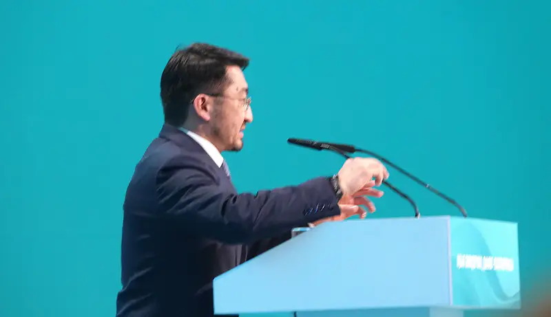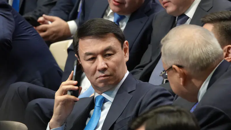 Через несколько секунд у трибуны уже стоит вице-премьер Жаслан Мадиев.