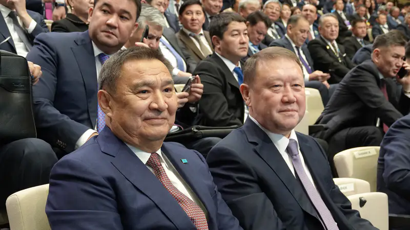 Рядом сидят акимы-соседи — Марат Ахметжанов (Акмолинская область) и Кумар Аксакалов (Северо-Казахстанская область).