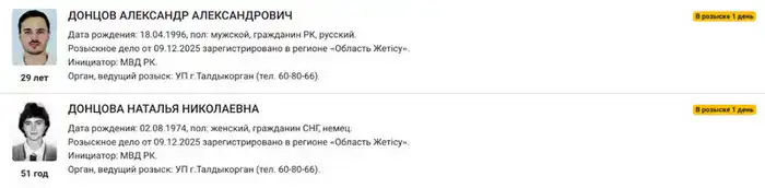 Согласно ориентировке, разыскное дело на Александра и Наталью Донцовых было зарегистрировано 9 декабря в области Жетысу. Инициатором розыска выступило Министерство внутренних дел, а управление полиции Талдыкоргана ведёт расследование.