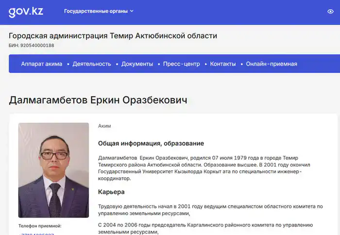 На сайте городской администрации города Темир указано, что акимом города является Еркин Далмагамбетов. По официальным данным, он был назначен на эту должность в июне 2024 года.
