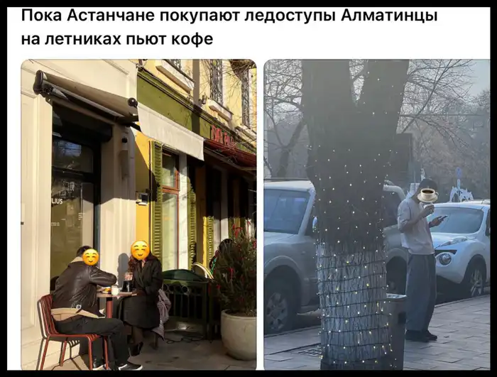 "Пока астанчане покупают ледоступы, алматинцы на летниках пьют кофе", - написал пользователь из Алматы.