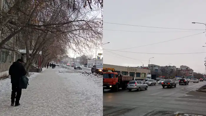 В Павлодаре, одном из самых холодных городов страны, температура также -6 градусов. На фотографиях видно, как местный житель продает последние ёлки, а другие горожане ждут автобус после рабочего дня.