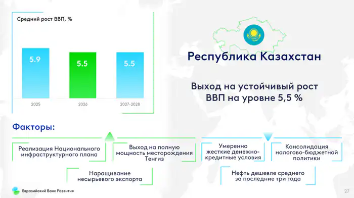 А вот аналитики Евразийского банка развития ожидают сохранение устойчивого роста экономики Казахстана на уровне 5,5 процента в 2026 году. Они отмечают, что реализация Национального инфраструктурного плана и запуск государственной программы "Заказ на инвестиции" смягчат негативное влияние пониженных цен на нефть.