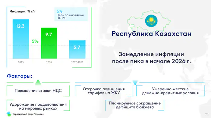 "Умеренно жёсткие денежно-кредитные условия обеспечат снижение инфляции до 9,7 процента на конец 2026 года после пика в начале 2026 года на фоне повышения НДС. Курс тенге в среднем по 2026 году составит 535 тенге за доллар. Факторами поддержки обменного курса выступят высокая базовая ставка и рост несырьевого экспорта", ― считают в ЕАБР.