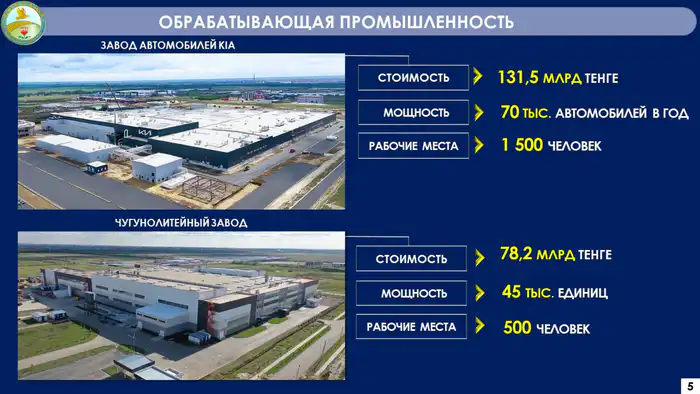 Объём промышленного производства в регионе за год достиг 3,5 триллиона тенге. Реализовано семь инвестиционных проектов на сумму 322,1 миллиарда тенге, что позволило создать 3,3 тысячи рабочих мест.