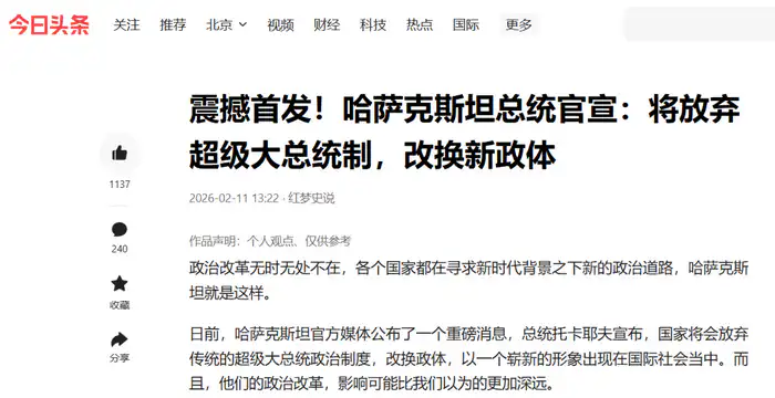 На китайском сервисе Toutiao также обсуждаются решения Токаева. Подчеркивается, что реформа политической системы была необходима, и сбалансированный подход к системе сдержек и противовесов может укрепить демократический характер республики.