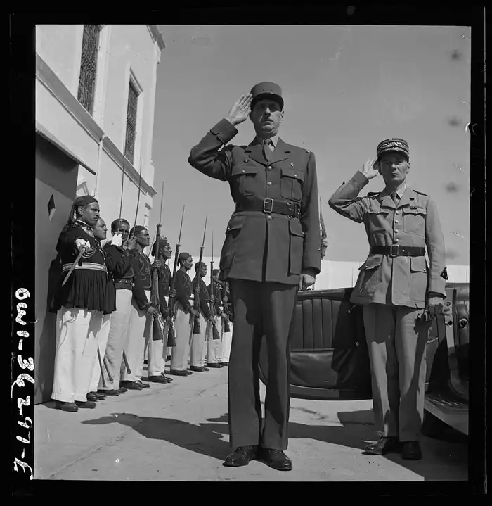 Шарль де Голль (в центре) в Тунисе, 1 июня 1943 года. Изображение доступно в Библиотеке Конгресса США. Автор: Marjory Collins