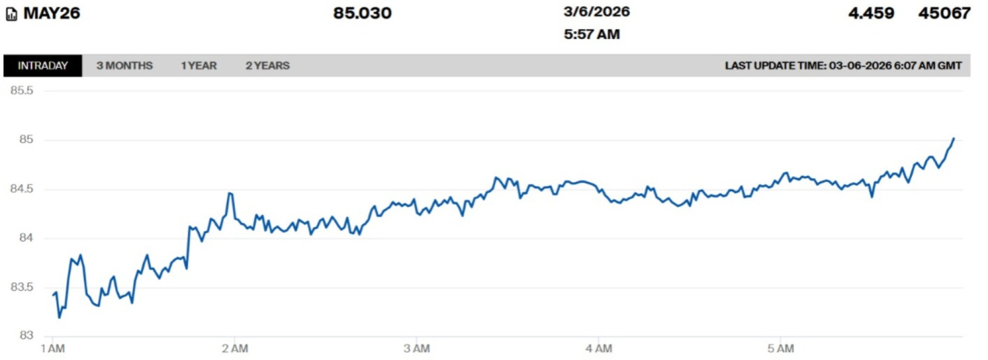 На лондонской бирже ICE стоимость майских фьючерсов на нефть марки Brent увеличилась на 4,45 процента, достигнув более 85 долларов за баррель, согласно данным торгов на 10:57 по времени Астаны.
