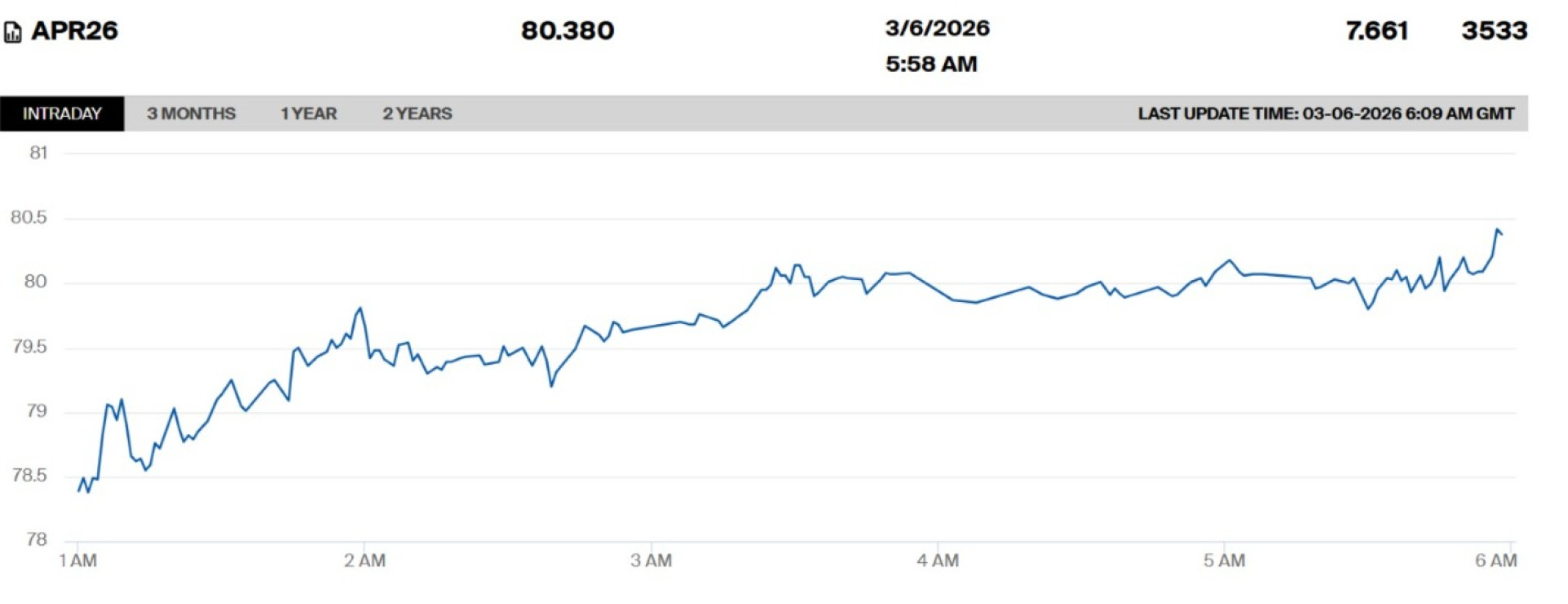 Апрельские фьючерсы на нефть марки WTI также показали рост на 7,66 процента, достигнув 80,38 доллара за баррель.