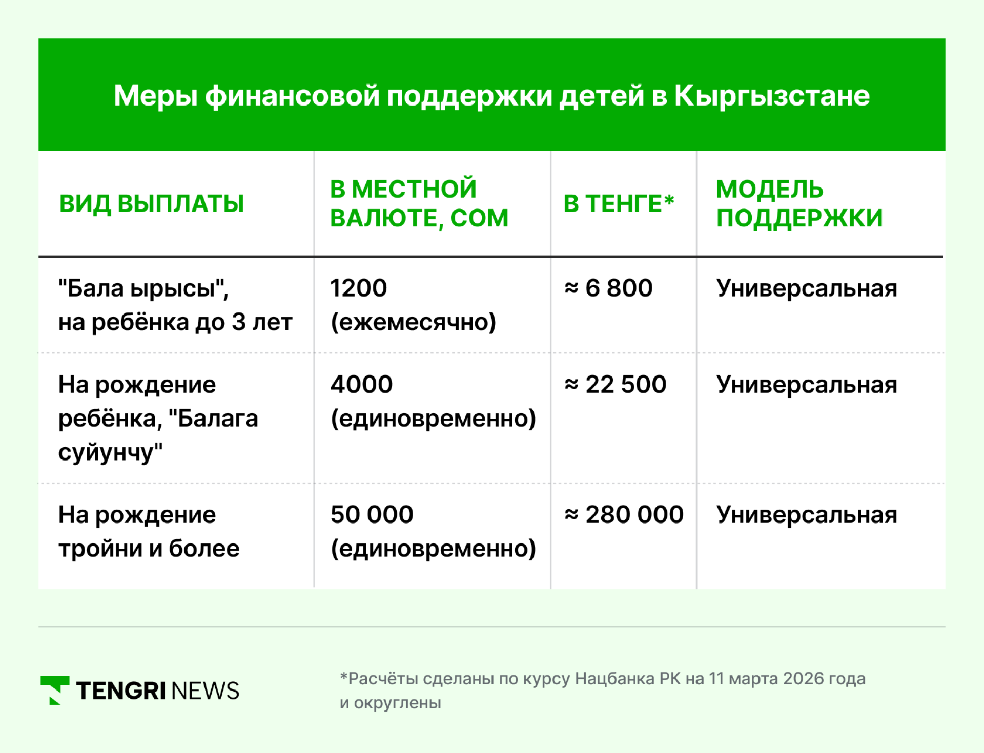 В Кыргызстане также есть похожие подходы, но с отличиями. С 1 июля 2026 года в стране запускается новая универсальная выплата "Бала ырысы" — по 1200 сомов (около 6 800 тенге) в месяц на каждого ребёнка до трёх лет, независимо от дохода семьи.