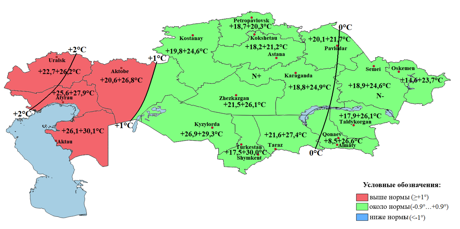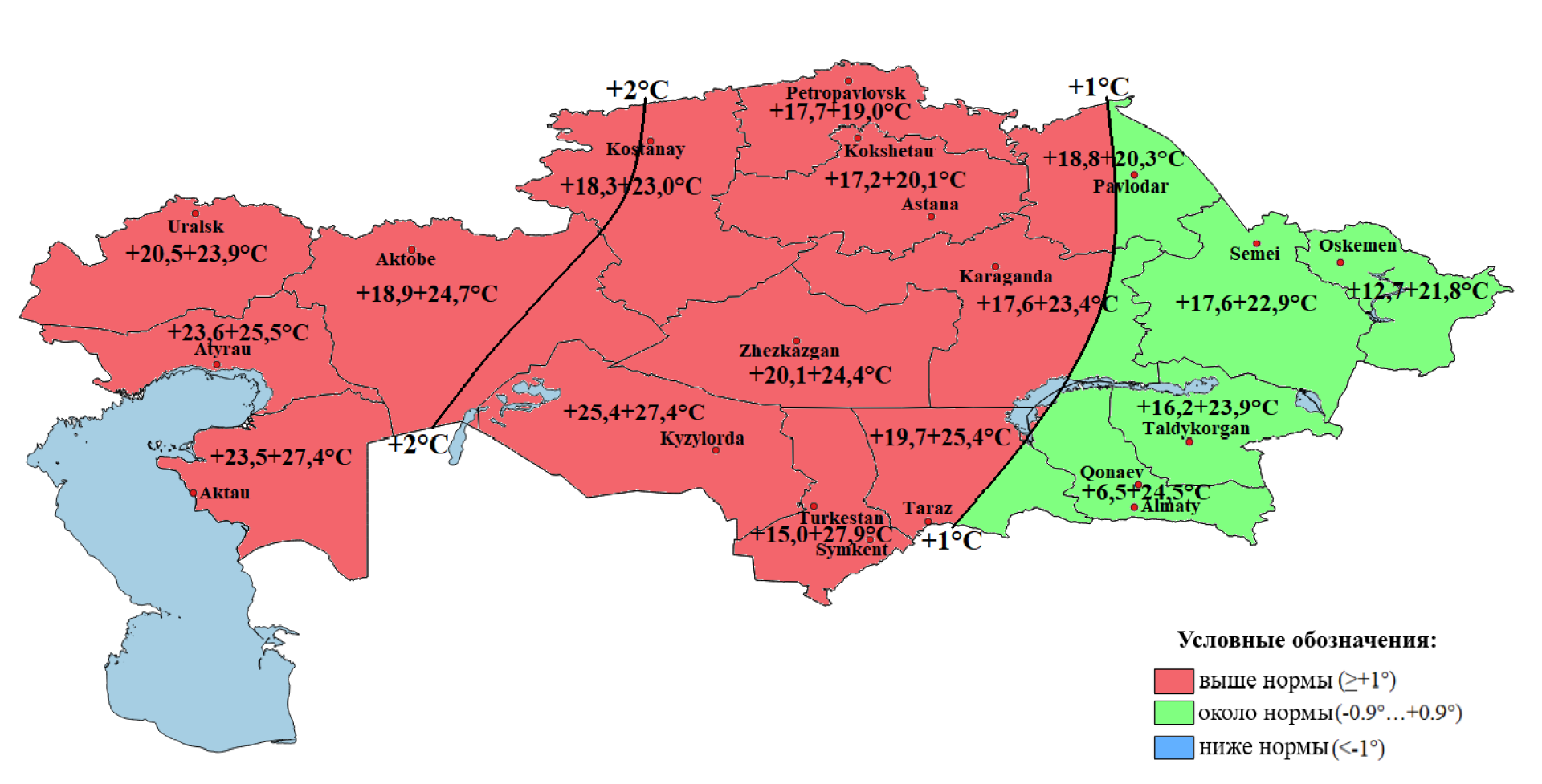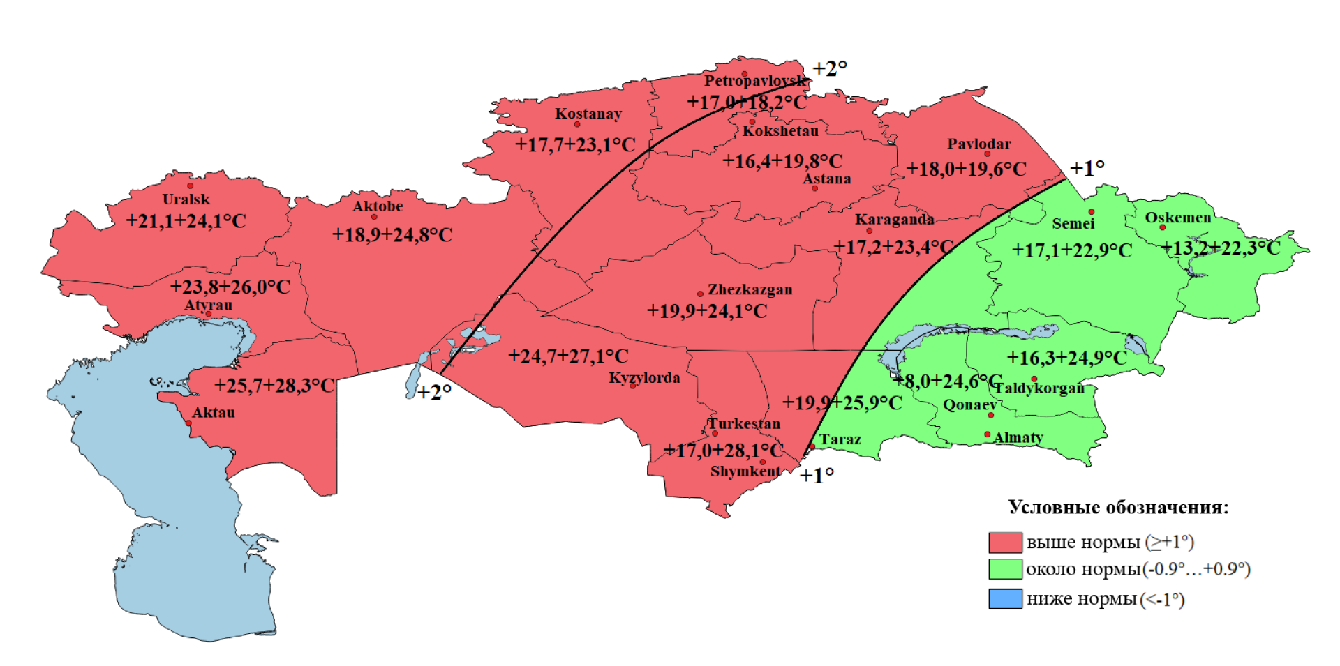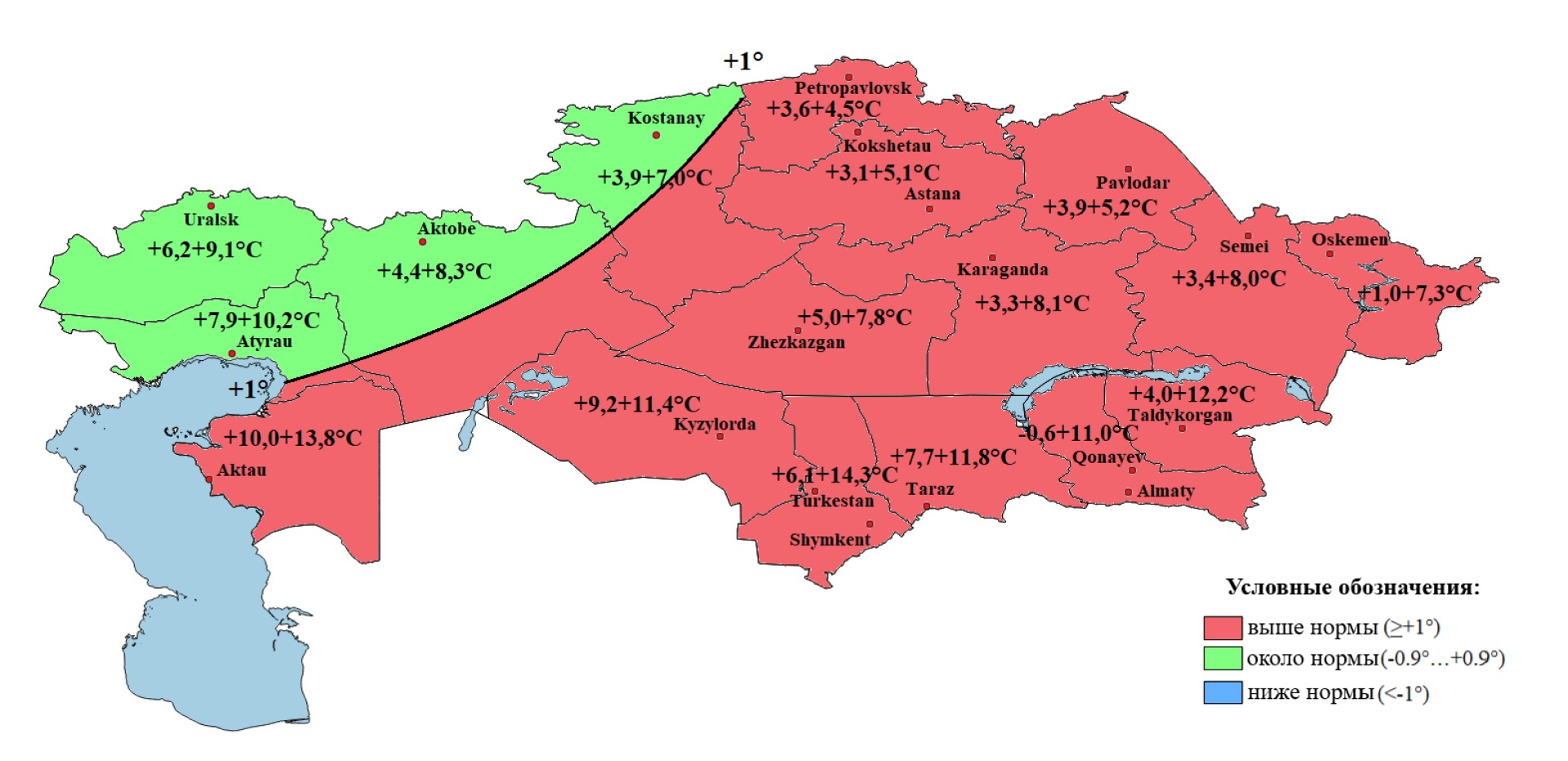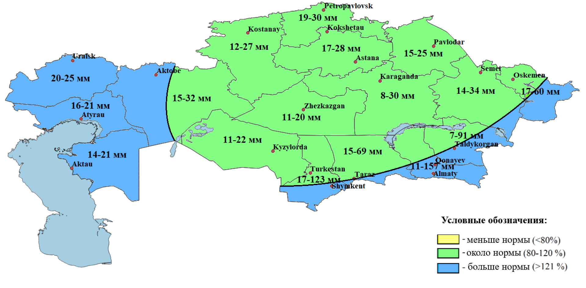 - но ниже нормы — в Мангистауской, Актюбинской, Кызылординской областях, а также частично в Атырауской и ряде центральных регионов.