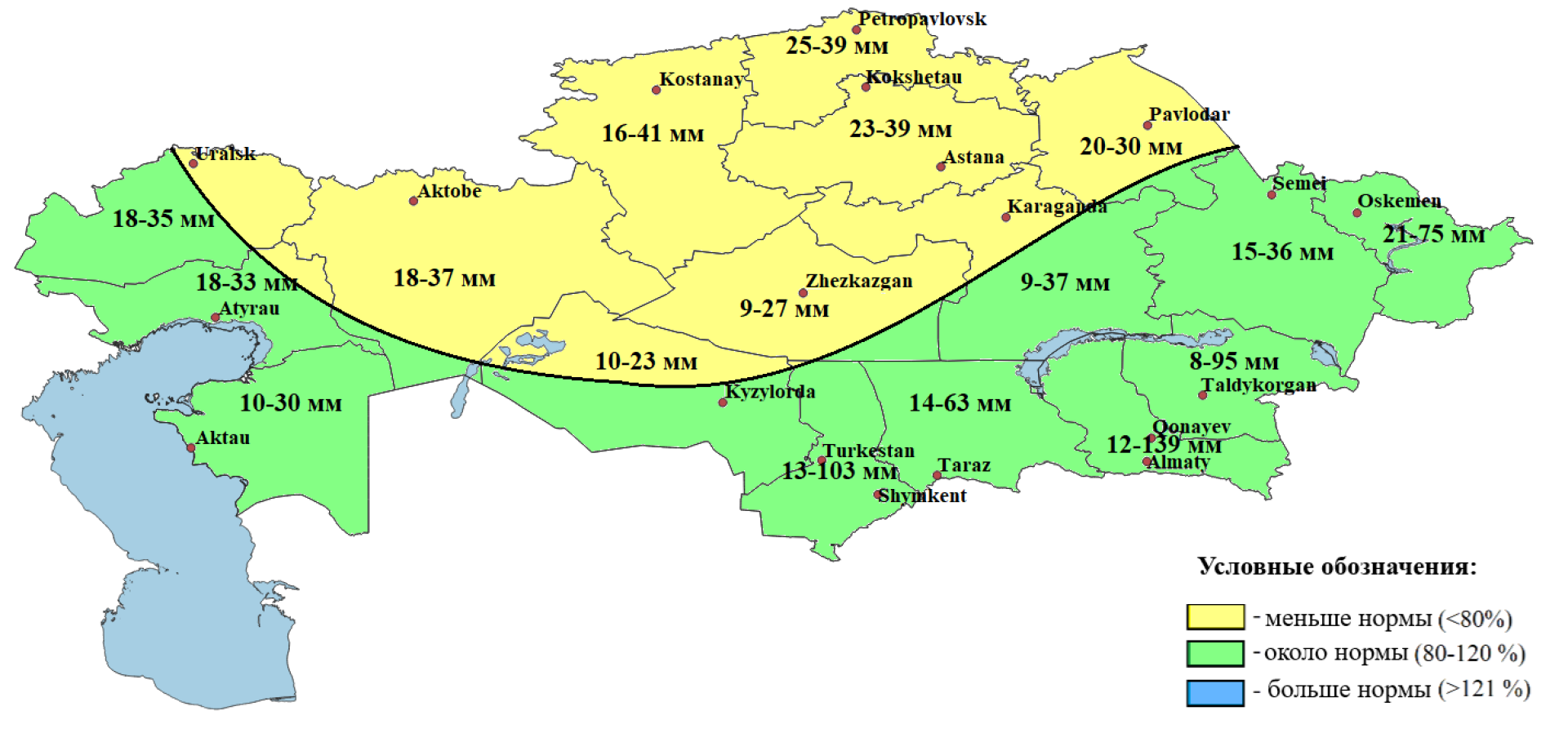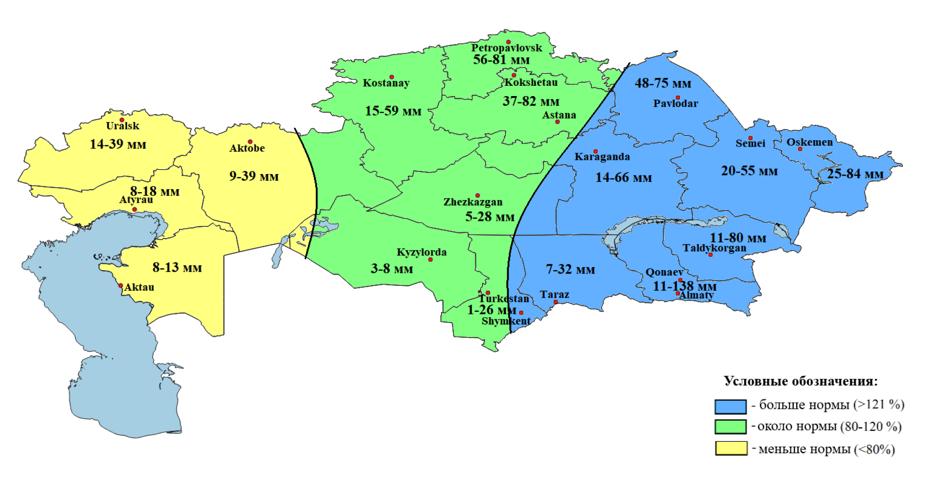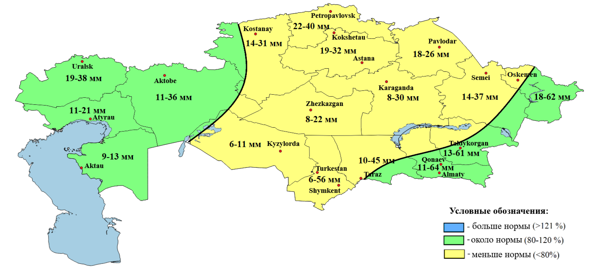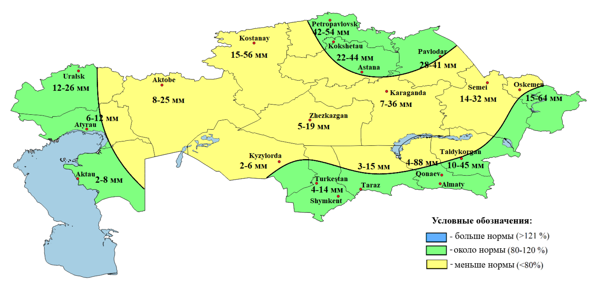 - меньше нормы — в северных регионах (Костанайская, СКО, Акмолинская), а также частично в западных и центральных областях.