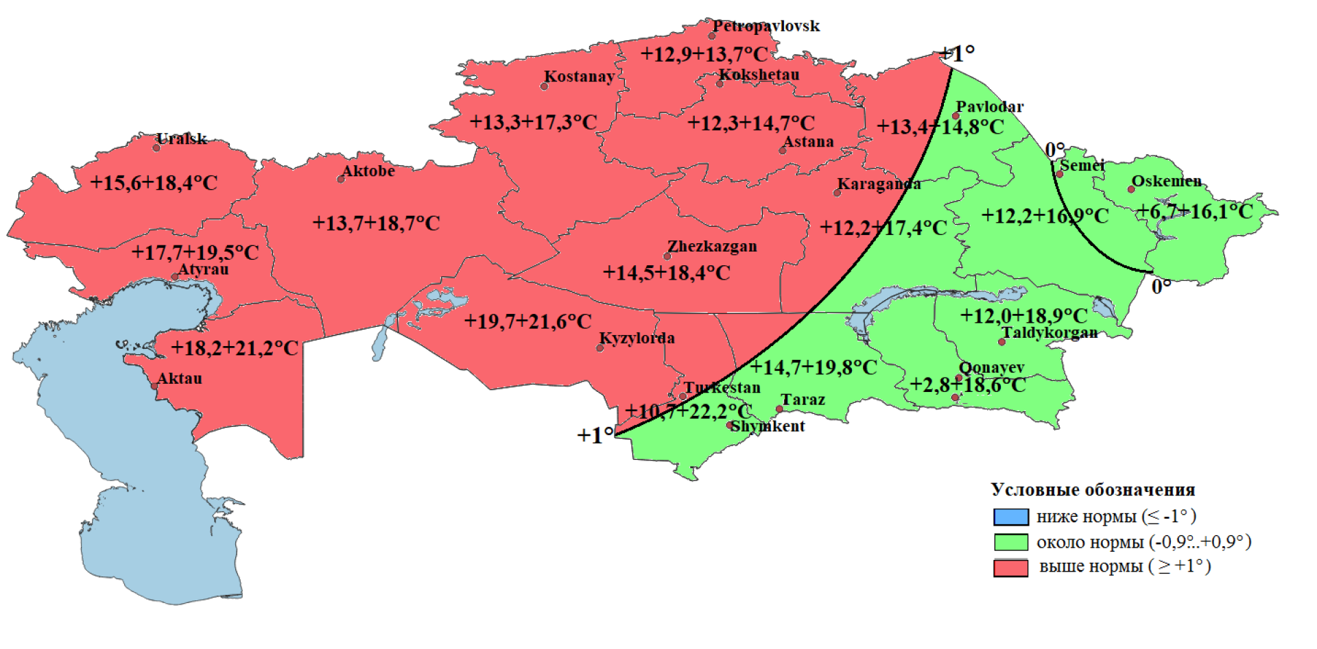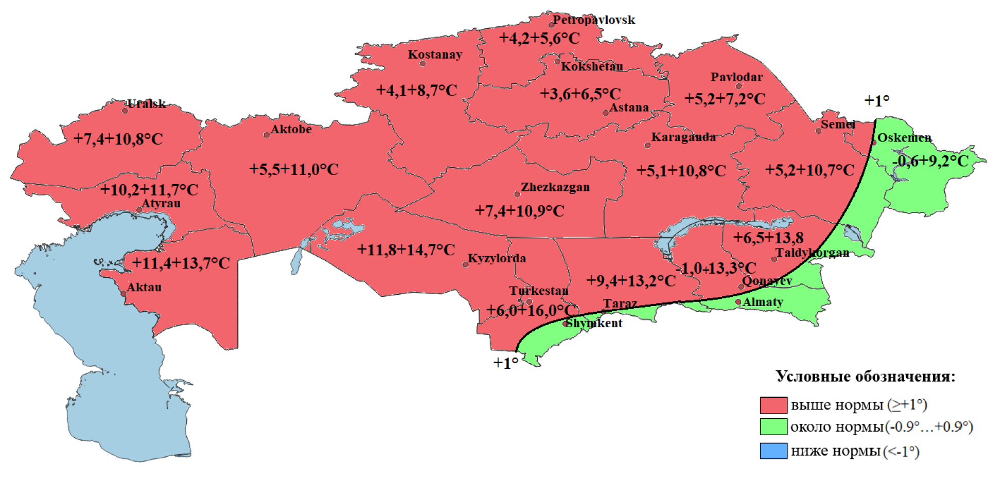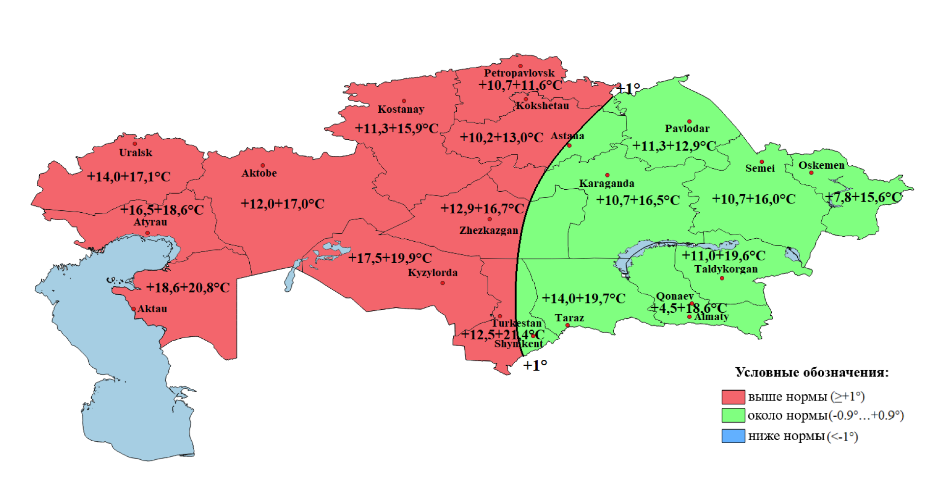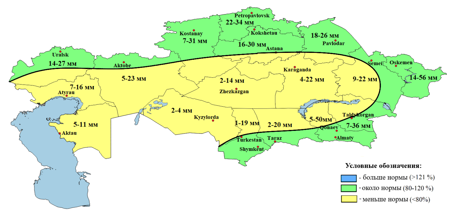 - меньше нормы — в северных регионах (Костанайская, СКО, Акмолинская), а также частично в западных и центральных областях.