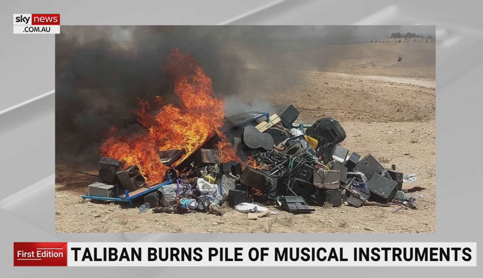 Уничтожение музыкальных инструментов в Афганистане. Стоп-кадр из видео с YouTube-канала Sky News Australia