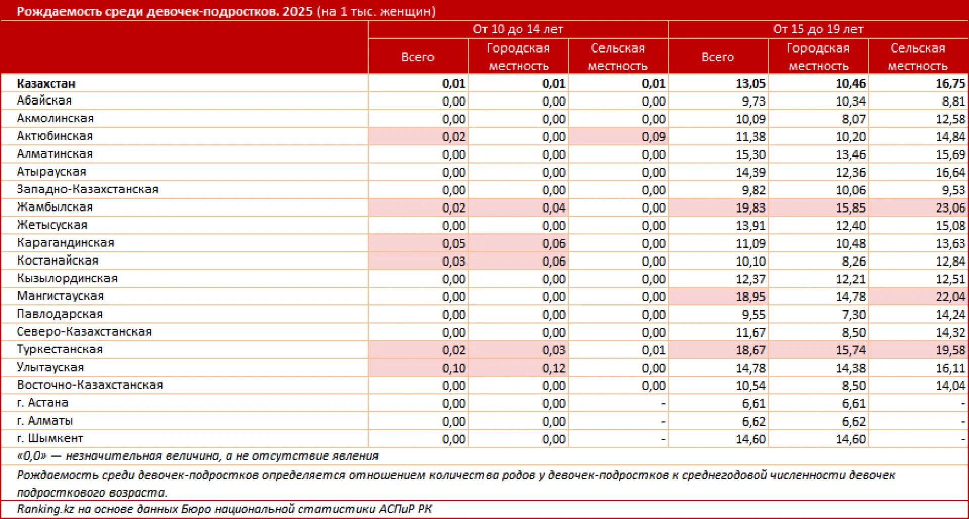 В 2025 году коэффициент рождаемости среди девочек в возрасте 15–19 лет в Казахстане составил 12,96 на тысячу девушек. При этом наблюдается значительная разница между городскими и сельскими районами: